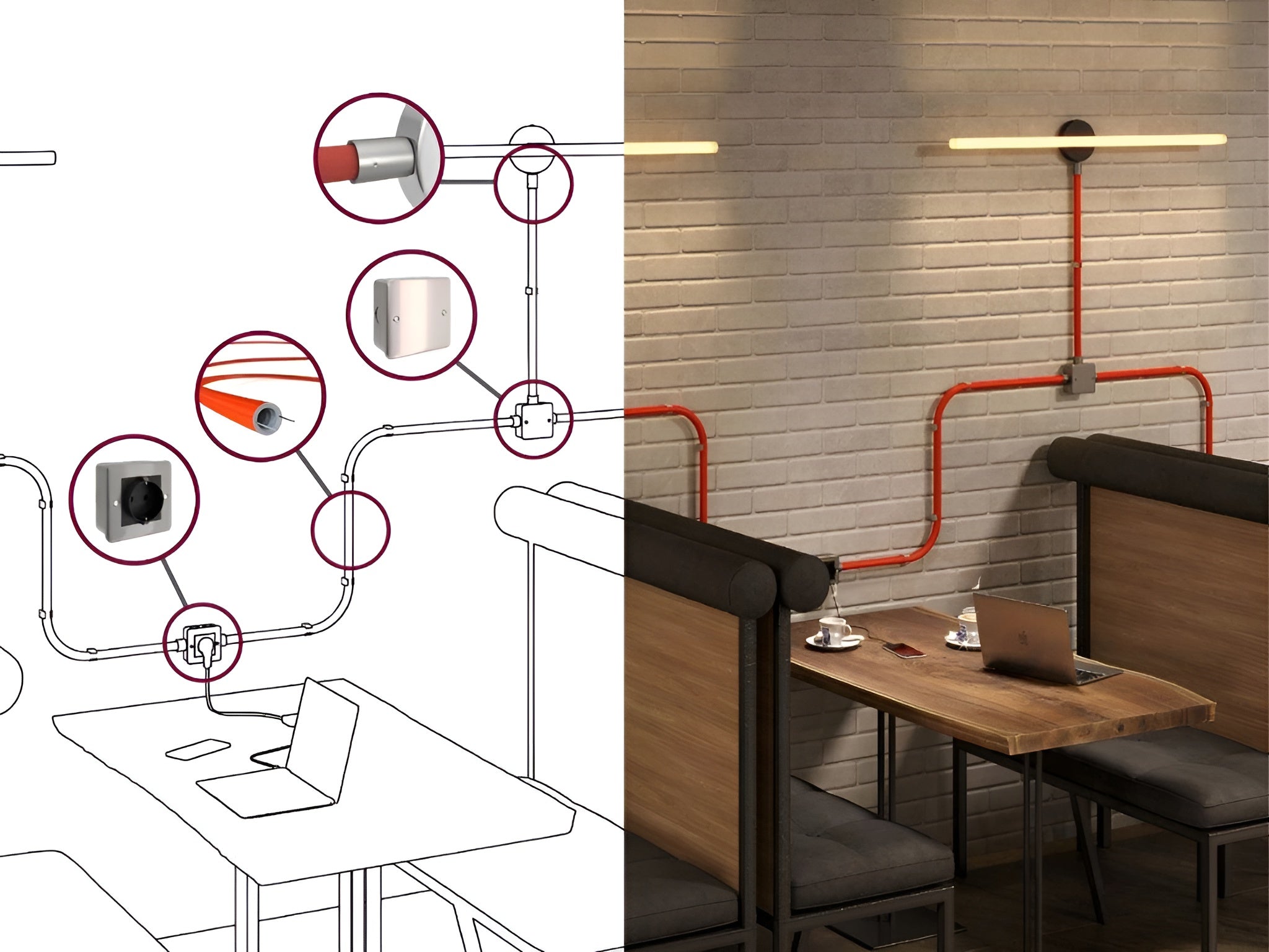 Come base per tutte le connessioni e i comandi abbiamo utilizzato i cavi e gli accessori TUBES, il sistema firmato Creative-Cables che unisce l'estetica del rivestimento tessile alla praticità di un vero e proprio impianto esterno muro, a cui abbiamo affiancato altri elementi come il Sistema S14, gli Spostaluce e i componenti in cemento come il Rose One e i portalampada E27 che si sono integrati perfettamente con lo stile industriale con tubi a vista della struttura.